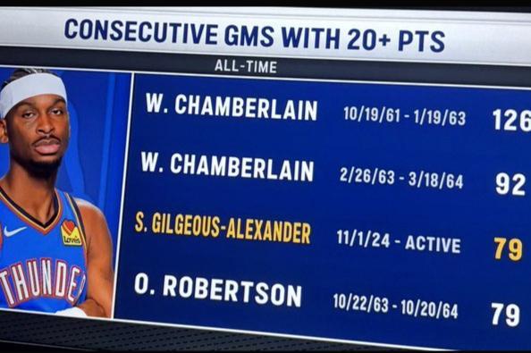 雷霆的建队思路真的让其余球队羡慕,全员都能打。今天上场的12名球员全部得分,其更是有8人得分上双!其中,亚历山大29分钟,14投8中得到了30分7助攻2篮板1抢断的全面数据。看起来都没怎么出汗,就拿到了30+。而这么一来,亚历山大达成了连续79场20+,成功追平‘大O’罗伯特森,并列排在历史第三位。而前两位,都是张伯伦。按照亚历山大本赛季的状态,冲击一下历史第一可能只是时间问题。对比雷霆,鹈鹕队管理层的操作简直就是一坨。休赛期向上交易选秀权,选中了奎因。而这位年轻人新赛季至今场均7.6分4.8篮板,没有命中一记三分。未来鹈鹕队的五场对手没有勇士,可能还要继续连败……