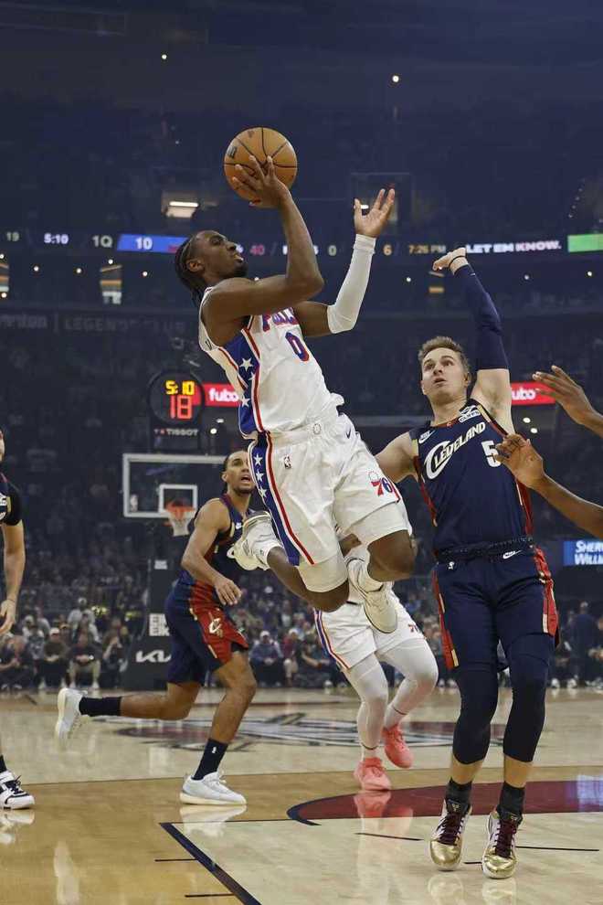 次节比赛,骑士继续维持51-38领先优势,76人一波7-0攻势追分,米切尔攻传结合引领一波8-2攻势扩大12分优势。马克西与沃特福德连续得分,骑士被追到63-58仅领先5分,骑士连得5分重新扩大10分优势,76人打出一波9-2攻势追分。骑士单节29-40被追回11分,上半场结束骑士被追到70-67仅领先76人3分。前两节比赛,骑士三分命中数12-6是76人两倍,骑士2人得分上双,米切尔9中6得到21分与莫布利15分,76人3人得分上双,马克西18+3+4、德拉蒙德10+9与沃特福德13分。